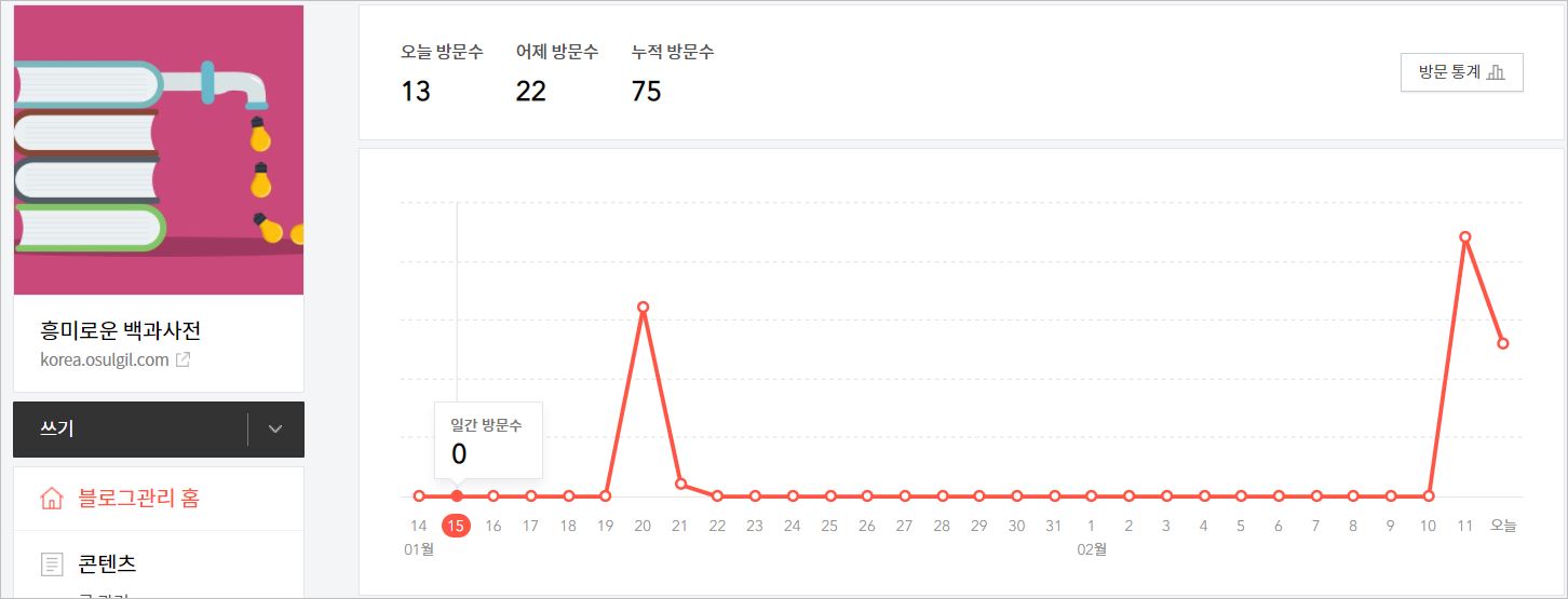 이게 왜 중요한가하면, 티스토리 블로그의 글은 쌓이면 쌓일수록 돈이 되기 때문입니다. 물론 키워드를 잘 잡아야 합니다. 일단 이 블로그의 방문 유입을 공개합니다. 오늘은 2022년 2월 12일입니다. 지금 13명인데 사실은 0명입니다. 제가 들어와 유입으로 잡힌 겁니다. 글은 현재 7개입니다. 도메인을 보면 알겠지만 2차 도메인을 입혔습니다. 현재 이 계정 자체가 다음으로부터 50% 정도 저품을 맞은 상태가 이 블로그도 함께 날아가서 다음에서 유입이 0입니다. 어쩔 수 없죠. 뭐... 하여튼 여기에 증거로 남겨 놓습니다.