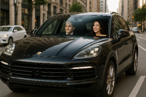 고급 자동차를 타고 산책길을 달리며, 파트너와 미래에 대해 웃으며 대화한다.