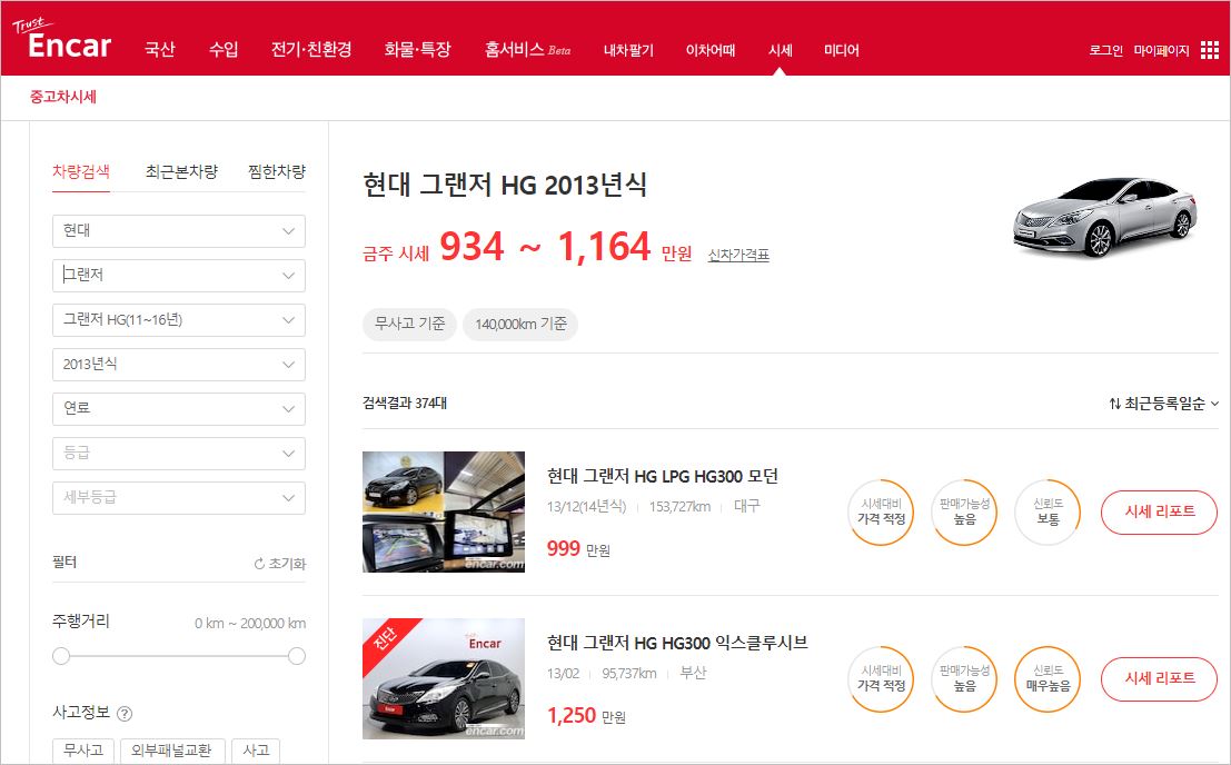 제가 가장 즐겨 찾는 곳은 엔카입니다. 그곳에도 시세 확인이 가능합니다. 차량 검색과 모델 명 등을 입력하면 대략적인 가격이 나옵니다.