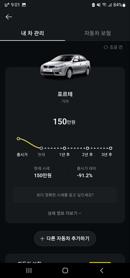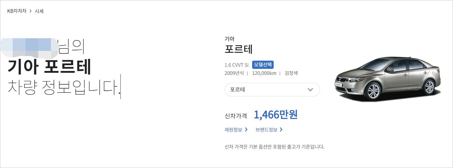 자신에 보시면 계좌 카드 투자 대출 등등이 보입니다. 그곳에서 [자동차]를 클릭해 자동차 등록번호를 입력하십시오. KB차차에서는 384만 원이 나왔는데 이곳에서는 150만 원 나왔습니다. 반도 안 되는 가격이네요. 이렇게 차이가 많이 나는 이유가 뭘까요? 저는 엔카로 가서 확인해 보겠습니다. 2009년 12만 포르테입니다.