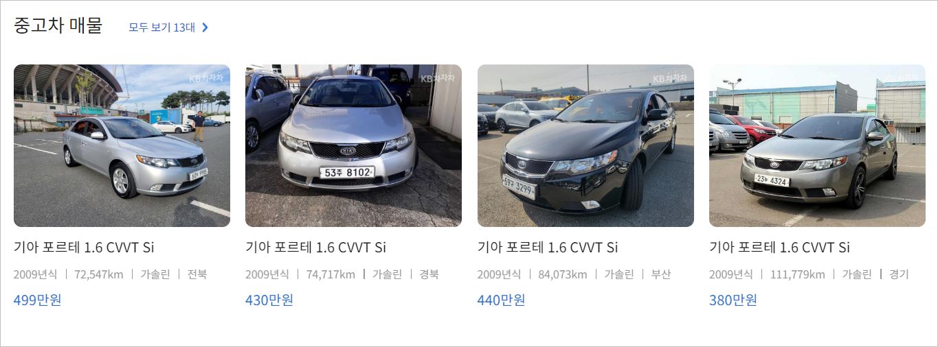확인란 아래에 동일한 차량의 같은 연식의 차량을 소개합니다. 2009년 포르테 가격입니다. 저와 동일한 차량인데 거의 90만 원 더 비 싸게 나왔네요. 아마도 주행거리가 짧아서 그런 것 같습니다.