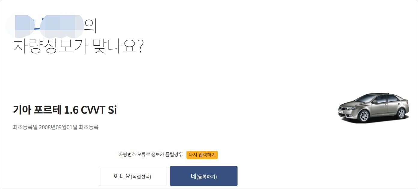 그럼 차량 확인하도록 실제 차량이 맞는지 보여줍니다. 차량 등록일과 차량 모델이 보이죠. 그럼 맞으면 네, 맞지 않으면 다시 입력하기로.