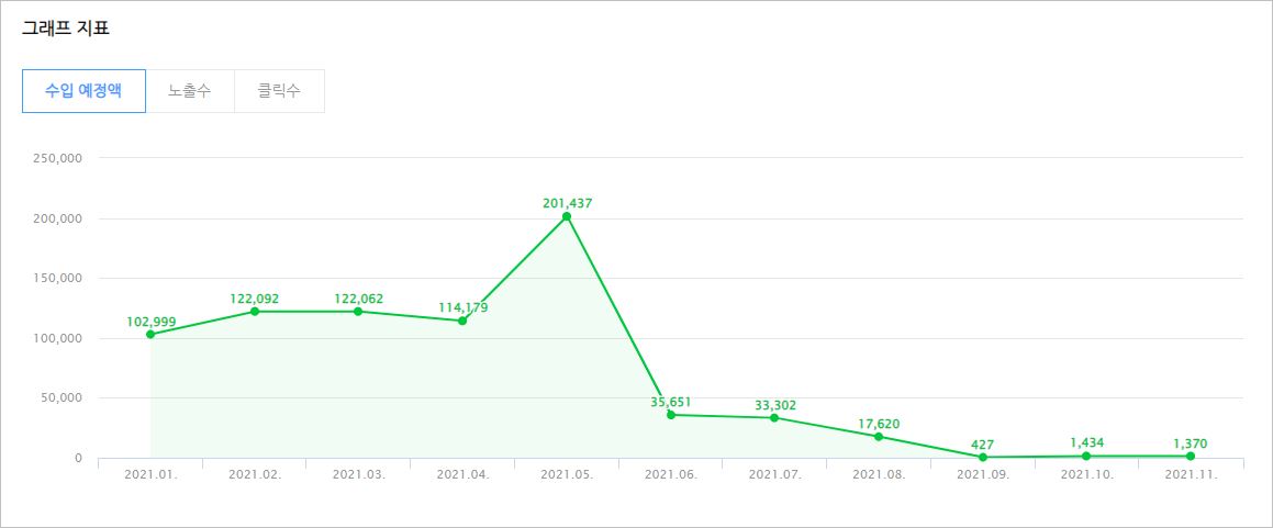 월별로 볼까요? 2021년 1월부터 11월까지 수익입니다. 잘 나가다 2021년 5월에 20만 원 정도 찍고 추락했습니다. 왜 저럴까요? 제가 바로 네이버 블로그를 하지 않는 이유입니다. 네이버 블로그는 다음에서 유입은 되지만 구글에서 유입이 되지 않습니다. 그러니까 네이버가 무슨 이유에서 저품을 먹이면 그걸로 끝입니다. 저는아무리 생각해도 왜 네이버가 제 블로그를 저품 먹였는지 알 수가 없습니다. 아직도 이해가 안 갑니다. 그냥 평범한 글이고 에세이인데 말이죠. 참 황당합니다. 지금은 조금 풀려서 20명 들어오다 다시 1,000명대로 갑자기 올라갔습니다. 오만 정이 다 떨어지더군요.