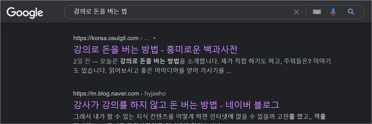 혹시 티스토리 글쓰기 구글에서 유입되는 글쓰기를 알고 싶은 분들은 지금 저의 글쓰기 패턴들을 잘 살펴 보십시오. 그냥 내용만 읽지 말고요. 이틀 전에 쓴 이 블로그의 [강의로 돈을 버는 방법]이 어제부터 구글에 노출되기 시작했습니다. 만 24시간이 걸리지 않았습니다. [강의로 돈을 버는 방법]과 [강의로 돈을 버는 법]으로 검색하면 최상단에 뜹니다. 이 키워드는 유튜브가 먼저 보이고 글이 뒤로 보입니다. 글로서는 가장 처음 글입니다. 단 하루 만에.
