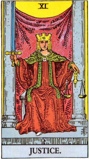 정의는 균형(Balance), 공정성(Fairness), 책임(Responsibility), 진리(Truth)의 원형을 상징합니다. 이 카드는 우리가 내린 선택의 결과를 감수해야 할 시점을 나타내며, 개인의 행위에 따른 결과가 반드시 돌아온다는 인과율(Causality)의 원칙을 반영합니다. 정의는 이성적 사고와 윤리적 판단의 중요성을 강조하며, 타인뿐만 아니라 자기 자신에게도 진실하고 책임 있는 태도를 요구합니다. 타로 리딩에서는 법적 문제, 도덕적 딜레마, 관계에서의 공정성 등을 묻는 질문에 등장하기도 합니다.