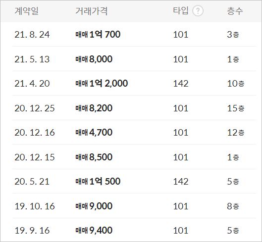 매매는 많지 않습니다. 8천만 원에서 1억 700만 원에 거래되고 있습니다. 수년 동안 가격 변동은 거의 없습니다. 자리가 좋아 평가는 상당히 좋은 편입니다. 92년에 집주한 아파트이고 시골인데 아직도 1억이 넘게 거래되고 있다는 것이 놀랍습니다.