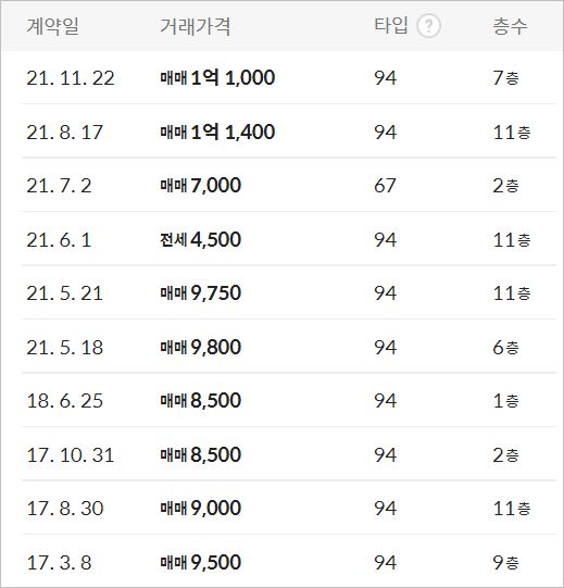 매매는 많지 않습니다. 8천만 원에서 1억 700만 원에 거래되고 있습니다. 수년 동안 가격 변동은 거의 없습니다. 자리가 좋아 평가는 상당히 좋은 편입니다. 92년에 집주한 아파트이고 시골인데 아직도 1억이 넘게 거래되고 있다는 것이 놀랍습니다.
