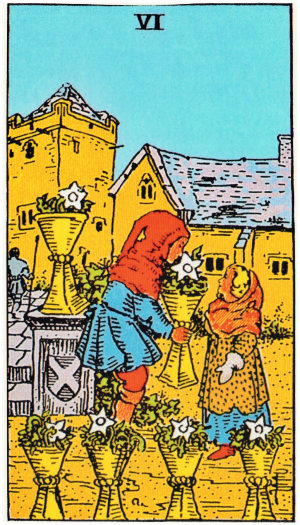 식스 오브 컵은 일반적으로 꽃이 가득 담긴 컵을 들고 있는 어린아이들이 등장하는 도상이 대표적입니다. 이 장면은 과거의 순수함, 무구한 시절, 조건 없는 사랑을 나타냅니다. 아이들이 등장함으로써 카드는 ‘어린 시절’, ‘순수한 감정’, 또는 ‘과거의 관계와의 재회’ 같은 해석을 자연스럽게 이끌어냅니다. 종종 이 카드는 현재 상황에 대한 지침이라기보다는 ‘감정의 원천’을 돌아보게 만드는 역할을 합니다. 또한, 배경에 보이는 옛 건물과 따뜻한 분위기는 감정의 안식처, 안전한 기억, 또는 정서적 회복의 장소로 해석됩니다. 이 카드는 전반적으로 무조건적이고 순수한 감정의 회복, 또는 과거의 감정을 다시 꺼내어 현재의 삶에 적용할 필요성을 암시합니다.
