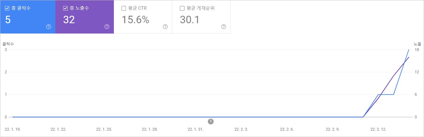 지금 저의 블로그 구글 유입 현황입니다. 위는 2월 12일까지. 아래는 오늘 날짜인 2월 16일까지입니다. 노출은 6배, 클릭은 5배. 뭐 너무 적어서. 그런데 게재순위가 23.2에서 30.1로 떨어 졌네요. 원래 글을 알아보기 위해서 요동치는 시기입니다. 클릴률(CTR)도 20%에서 15.6으로 떨어졌습니다. 전반적으로 하락했지만 노출과 클릭은 5-6배 상승했습니다.