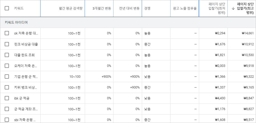 거두절미하고 구즐애즈에서 가져온 클릭단가입니다. 위에서 말씀드렸지만 여기에 나온 단가가 실제로 집행되는 것은 아닙니다. 가끔씩 그런 단가가 나오기는 하지만 대부분 매우 단가가 낮습니다. 이유는 위의 글을 읽어 보시면 압니다. 그럼에도 블로그가 어느 정도 시간이 지나고, 고단가 키워드를 계속하여 사용하게 되면 결국에는 높은 수익을 창출할 수 있습니다. 문제는 이런 키워드로 얼마나 많은 글을 써낼 수 있는가입니다. 제가 몇 번을 시도하다 실패한 이유는, 제가 보험이나 대출, 부동산 쪽으로 아는 지식이 없습니다. 그래서 몇 개 쓰다 글이 안 써집니다. 너무 머리가 아픕니다. 주식도 아는 게 없으니 글이 안 됩니다. 그래서 못씁니다.