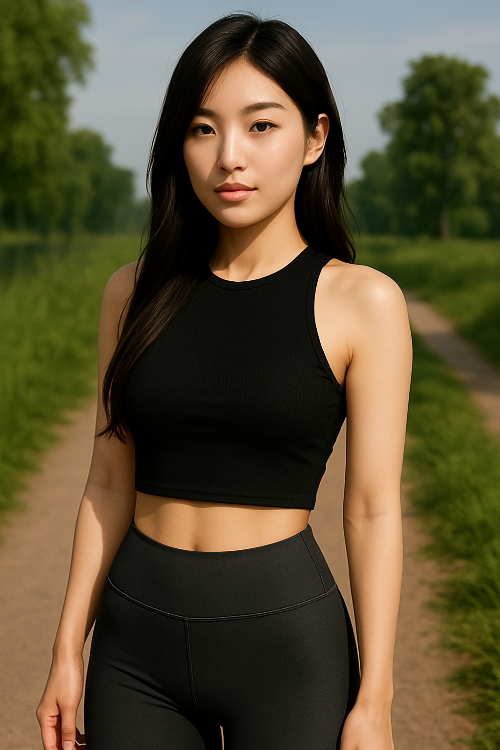 - 코디: 블랙 슬리브리스 크롭탑 + 다크 그레이 레깅스