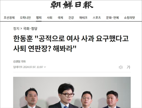 동아일보 기사에는 김건희 여사의 명품백 논란에 사과하겠다는 문자를 받고 적절한 답을 하지 않은 것에 대해 실제 당협위원잘이 한동훈 후보의 행동이 이해가 가지 않는다고 밝혔다.