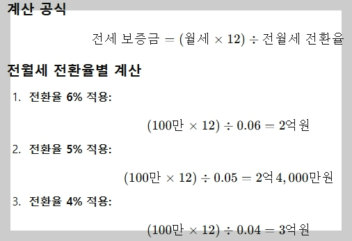 전세 보증금=(월세×12)÷전월세 전환율\text{전세 보증금} = (\text{월세} × 12) ÷ \text{전월세 전환율}