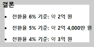 - 전환율 5% 기준: 약 2억 4,000만 원