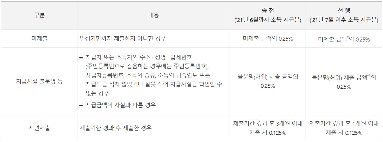 미제출, 지급사실 분분명 등은 0.25%의 가산세가 추가됩니다.