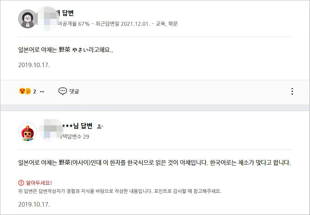 이들의 주장은 야채(野菜)라는 한자어는 일본어로 야사이(やさい)로 읽으며, 일본어를 그대로 한자만 가져와 야채가 되었기 때문에 일본어라고 말합니다. 그러니까 야채라는 한자어가 구한말이나 일제 강점기 이후 들어왔다는 말이 됩니다. 만약 그렇다면 야채는 외래어가 됩니다. 과연 그럴까요?