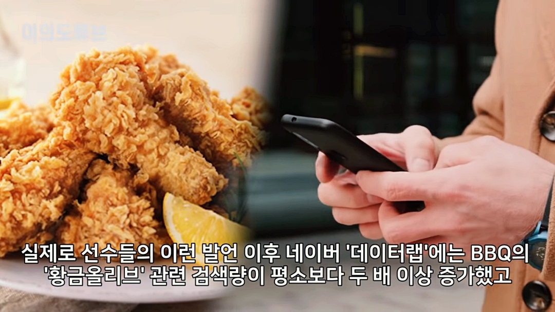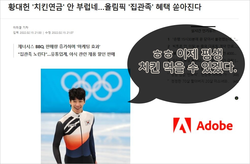 동계 올림픽 선수들의 치킨 발언이 나오자 우리나라 국민들은 치킨 연금을 검색하기 시작했고, 동계 올림픽 기간 동안 황금올리브치킨을 비롯하여 황대헌 선수가 좋아하는 황금올리브 닭다리 제품이 일시 품절 현상까지 일어났다고 합니다. 오호... 우리 회장님 역시 장사 잘하시네. 시원하게 쏘신다니 국민들이 알아서 팔아 주네요.