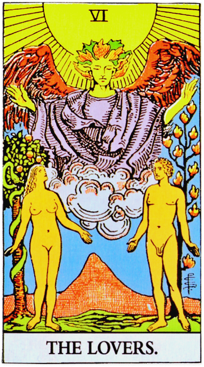연인카드는 메이저 아르카나(Major Arcana) 6번 카드로, 인간 관계와 선택의 중요성을 상징하는 카드입니다. 카드에는 남성과 여성, 그리고 그들 위에서 축복을 내리는 천사의 모습이 그려져 있습니다. 이들은 에덴동산의 아담과 이브를 연상시키며, 순수한 사랑과 유혹 사이의 긴장을 보여줍니다. 타락이전의 상황이며, 마귀의 그림은 타락 이후를 전제로 합니다. 배경에는 나무와 뱀이 함께 등장하여 선택의 순간이 가져올 결과를 암시합니다. 천사의 존재는 인간이 신성한 인도하에 자유 의지를 행사해야 함을 상기시키며, 연인카드는 단순한 연애를 넘어서, 인생의 중요한 결정을 내릴 때 직면하는 갈등과 통합의 과정을 상징합니다. 특히 이 카드에서는 사랑과 유혹, 책임과 자유 사이의 균형을 잡는 것이 얼마나 중요한지 강조합니다. 그러니까 사랑에는 책임이 따르는 것이할 수 있습니다. 사랑은 곧 선택이기도 합니다.