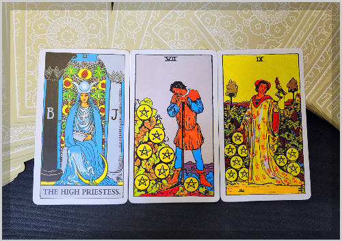 - 전체 흐름 읽기: 세 카드는 개별적인 정보가 아니라, 하나의 정서적 스토리를 구성합니다. 예를 들어, ‘완드 3 → 소드 9 → 펜타클 4’가 나왔다면, 그는 새로운 기회를 모색하고 있지만 죄책감에 시달리며 동시에 마음을 닫고 있는 상태로 해석됩니다.