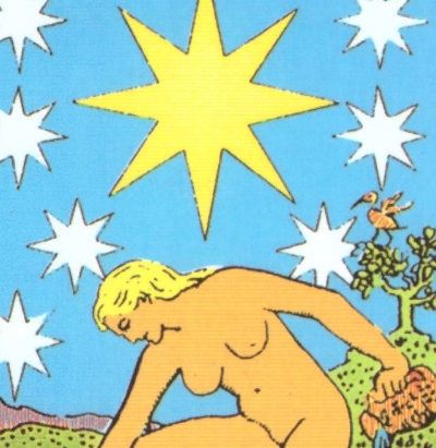 별 카드에는 한 여인이 물을 붓고 있고, 멀리 하늘에는 새 한 마리가 날고 있는 모습이 보입니다. 이 새는 주로 황새나 학처럼 우아하고 고요한 종류로 그려지며, 희망과 영적 연결을 상징합니다. 별 카드는 치유와 희망의 메시지를 담고 있는데, 이 새는 그 메시지를 하늘로부터 받은 듯한 형태로, "빛의 안내자" 역할을 합니다. 영적 세계와 인간 세계를 잇는 사자인 동시에, 고요 속에서도 자신의 길을 묵묵히 따르는 영혼의 안내자로 볼 수 있습니다.
