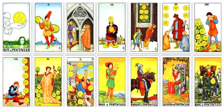 펜타클은 흙(Earth)의 원소와 대응하며, 이는 실용성, 안정성, 물질적 자원, 노력에 대한 보상이라는 의미를 내포합니다. 이 슈트는 우리가 땅 위에 발을 딛고 살아가며 직면하는 가장 현실적인 문제들—돈, 건강, 직업, 육체적 삶의 안정—을 다루는 영역입니다. 타로 리딩에서 펜타클 카드들이 많이 등장한다는 것은 물질적 문제에 대한 집중 또는 현실 세계에서의 성취와 관계된 주요 이슈가 있다는 신호입니다.