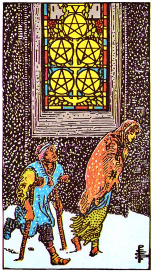 결핍, 소외, 경제적 불안정의 상징입니다. 실질적인 어려움뿐 아니라 감정적 고립, 영적 소외의 상태도 암시합니다. 하지만 도움을 요청하면 구원이 가능하다는 메시지도 내포합니다.