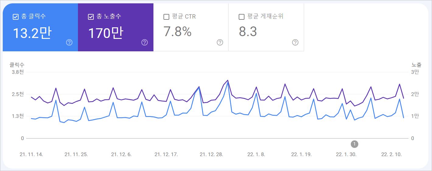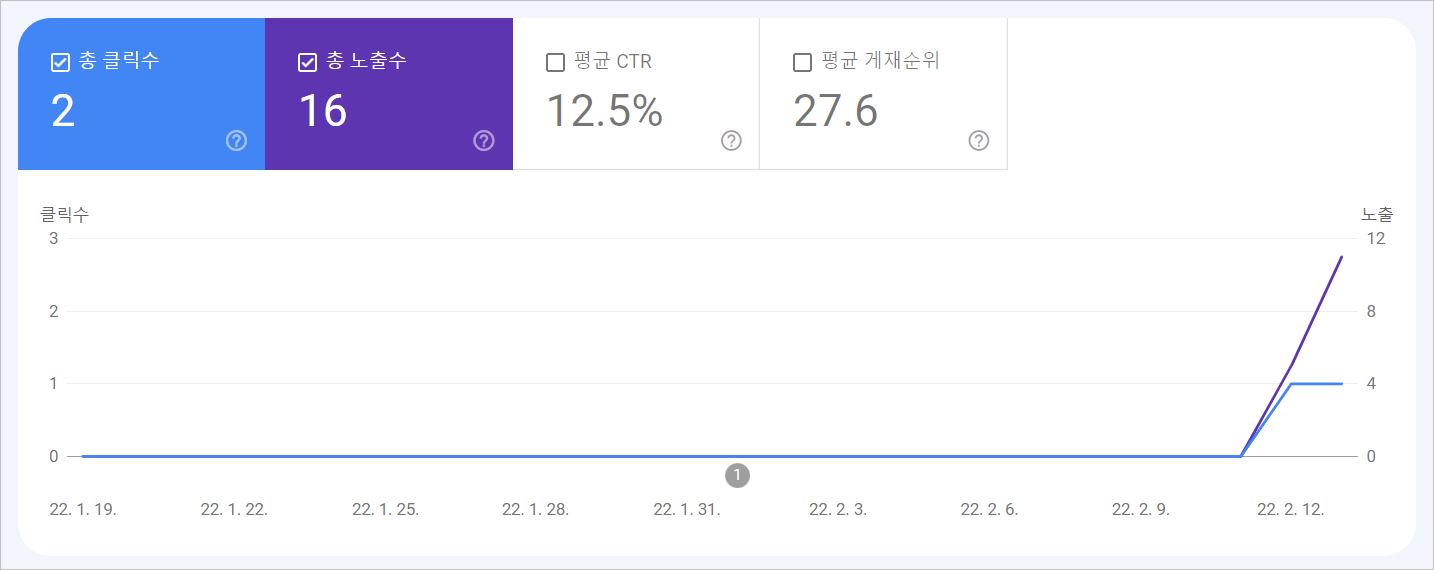 구글 콘솔에 들어가니 어제까지 무려 16번의 노출이 일어났고 2번의 클릭이 일어났습니다.