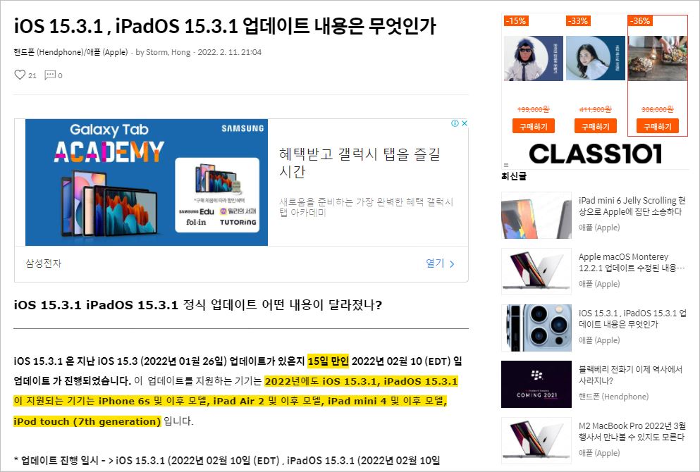 캡처 사진 하나 볼까요. 아이폰 검색해서 나온 티스토리 블로그입니다. 보면 본문과 오른쪽 사이드바에 두 개의 광고가 보입니다. 글은 아이패드이고, 광고는 갤럭시 태보가 강의 플랫폼인 클래스101입니다. 어려 분이 검색 자라면 어떤 광고를 클릭하고 싶습니까? 당연히 갤럭시 탭이죠. 비슷하니까. 이게 연관성입니다. 주제를 잡을 때 광고와 아무 상관없는 글이 있고, 상관 높은 글이 있습니다. 가능한 주제를 잡을 때는 이러한 광고 매칭률, 또는 마케팅의 입장을 고려해 주를 잡는다면 더 높은 클릭률(CTR)을 얻게 됩니다. 당연히 수익도 올라가죠. 이건 키워드 부분에서 다시 상세하게 다룰 예정입니다.