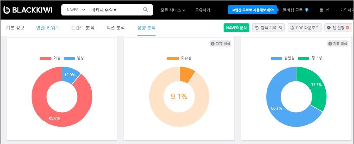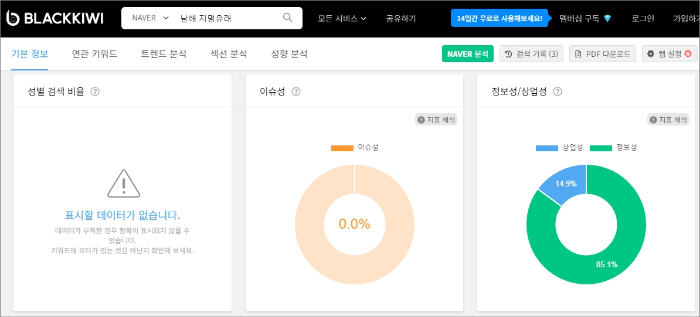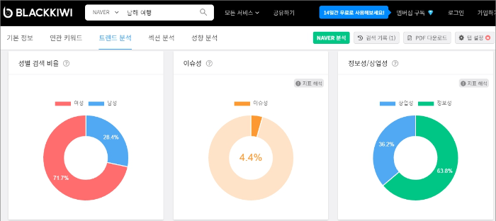키워드를 이해하지 못하면 광고 클릭율을 모릅니다. 아래는 블랙위키에서 제공하는 내용으로 '남해 여행'과 '남해 지명유래'를 검색했습니다. 결과를 보시면 남해 여행은 상업성이 36%지만 '남해 지명유래'의 경우 고작 14%입니다.