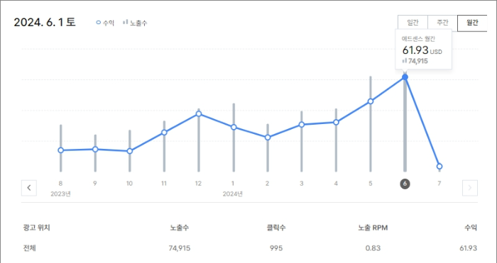 블로그의 유입이 많으면 수익이 많아집니다. 하지만 하지만 정비례로 올라가는 것은 아닙니다. 주제와 블로그의 운영 시기에 따라 천차만별이기 때문입니다. 그럼에도 유입이 적은 것보다 유입이 많으면 수익은 당연히 많아집니다. 최근 들어서 유입이 많아도 수익이 거의 없다는 사람들이 있습니다. 그것은 아마도 티스토리 자체광고 때문과 글쓰기 방식의 차이 때문으로 보입니다.