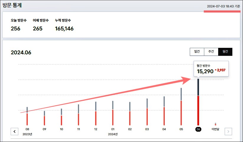 다양한 변수가 있지만 아래의 이미제서 보듯 유입이 계속해서 늘어난 것을 알 수 있습니다. 글도 어쩌다 하나씩 썼는데 말이죠. 결국 라꼬스킨으로 저의 블로그의 대부분을 다 교체했습니다.