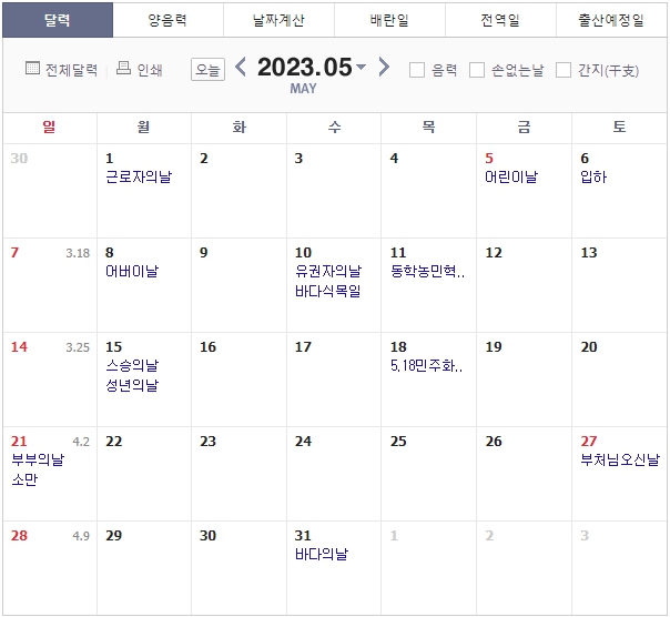 2023년 5월 기념일 휴일