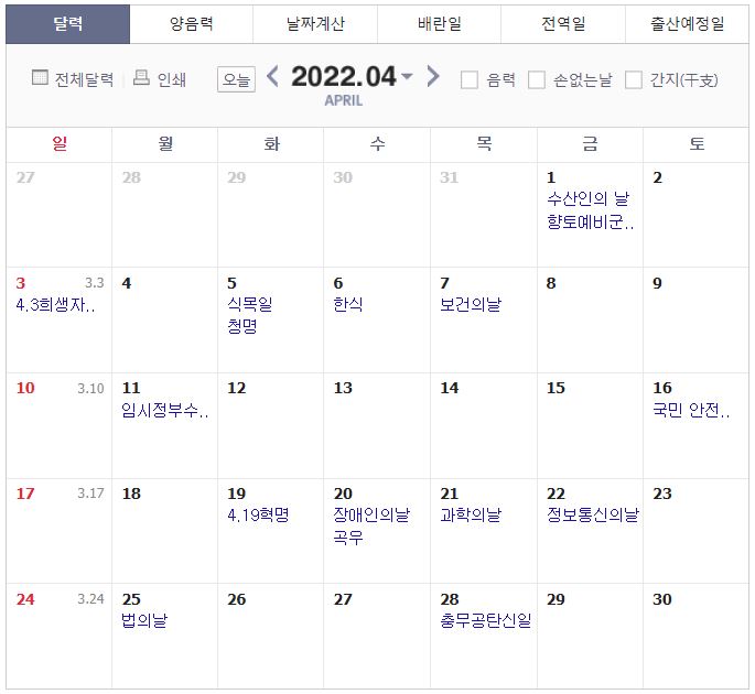 한식은 동지로부터 105일째 되는 날입니다. 설날, 단오, 추석과 함게 4대 명절입니다. 음력으로 2월 또는 3월에 듭니다. 한식은 청명절 다음날이기도하고, 같은 날이기도 합니다. 양력으로 4월 5일이나 6일 경으로 식목일과 겹치기도 합니다. 청명은 나무 심기 좋은 날로 여겼습니다. 우리나라가 4월 5일을 식목일로 정한 이유도 여기에 있습니다. 한식은 24절기에는 들어가지 않습니다.