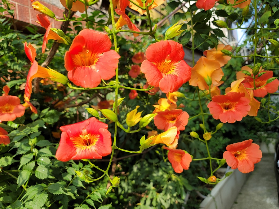 양반꽃으로도 불리는 능소화는 여름에 중심에 선 꽃입니다. 도톰한 꽃잎이 은은한 매력을 풍깁니다. 약간의 독이 있다고 하며 6월 하순부터 8월 하순까지 피는 꽃이 핍니다.