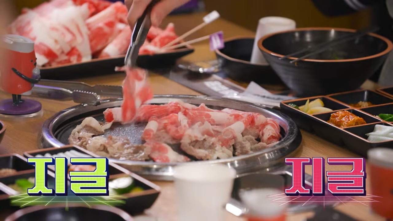 지민은 돌초밥 먹는 법을 알려 주네요. 잘 익은 차돌박이는 밥에 싸서 먹습니다. 그 맛이 최고죠.