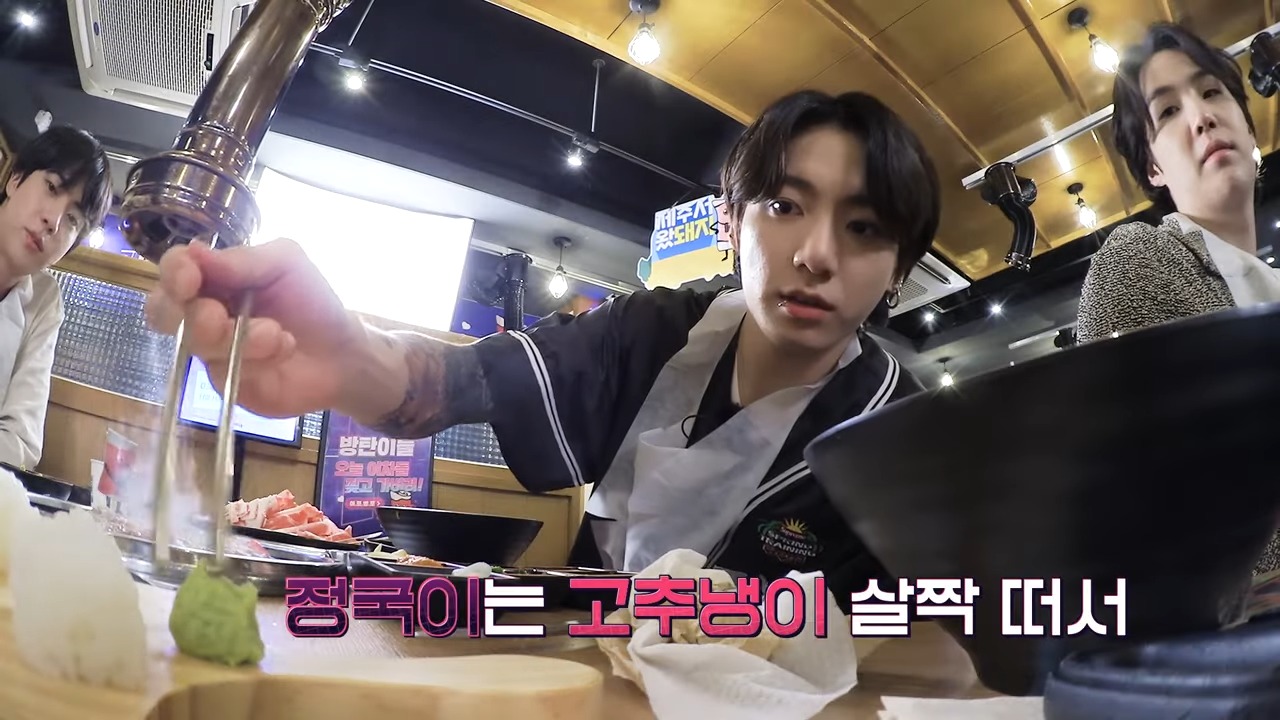 정국이는 고추냉이(와사비)와 함께 먹는데, 고추냉이는 느끼한 한우의 맛을 잡아 줍니다. 하지만 고추냉이를 너무 많이 먹으면 매우니 살짝만 넣어 먹어야 합니다.