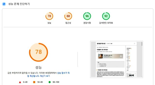 구글에서 사이트 진단을 하면 검색엔진최적화는 90을 훌쩍 넘긴다. 티스토리 서버가 얼마나 좋지 않은가 아는 사람은 알 것이다. 하지만 이 스킨은 그러한 단점을 상당히 상쇄키는 힘을 가지고 있다.