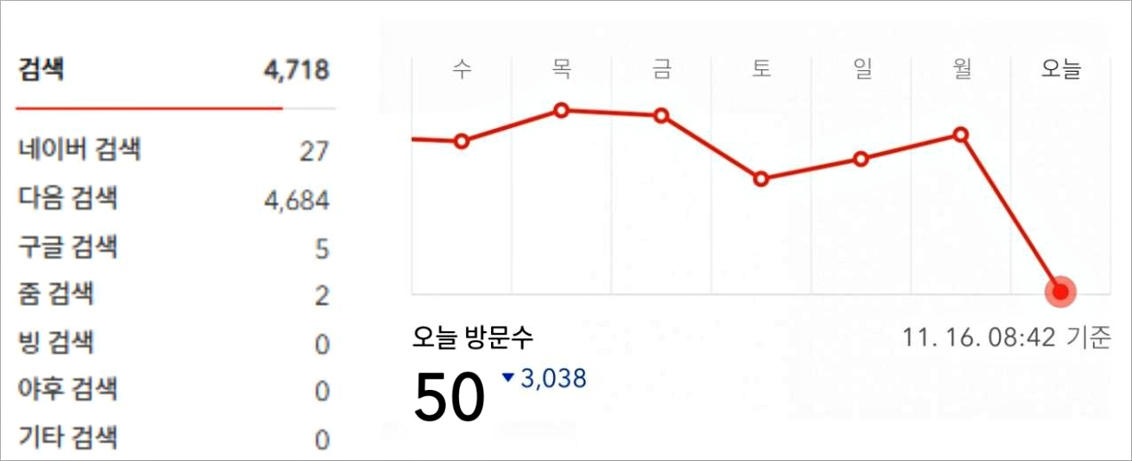 어제 77명까지 유입되는 거보고 잠이 들었는데 오늘 블로그 열어보니 98명까지 유입되었습니다. 오늘은 얼마나 올지 궁금합니다. 하지만 이건 순수 방문자가 아니라 그리 좋은 건 아닙니다. 하여튼 오늘 이야기 주제인 다음 저품에 대해 이야기하겠습니다.