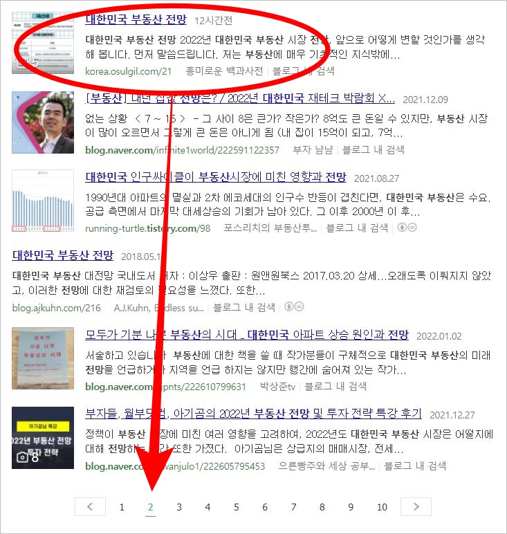 두 번째는 아무리 글을 잘 쓰고 많이 써도 1페이지 안에 들어오기는 거의 불가능합니다. 아무도 쓰지 않고 찾지 않는 제목이나 주제로 글을 쓰면 최상단에 뜹니다. 하지만 일반 글은 절대 1페이지 안에 들어오지 못합니다. 제가 이글뿐 아니라 다른 글도 몇 개 시험하니 완전히 똑같습니다. 하지만 제목을 완전히 똑같이 검색하면 1페이지 안에 들어오는 글이 몇개 있습니다. 그런데 누가 그렇게 검색하겠습니까?