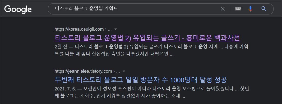 어제 쓴 [티스토리 블로그 키워드] 관련 글이 현재 구글에서 검색하면 5번째로 링크되어 있습니다. 하루 만에 이 정도 올라갑니다. 글을 어떻게 쓰느냐에 따라 완전히 다르게 반영됩니다. 참고로 이 글은 글을 쓰고 구글 콘솔에 색인 요청을 합니다.