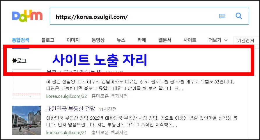 다음 최적화일 때는 자신의 티스토리 블로그를 주소창에 넣으면 사이트로 인식하고 소개합니다. 하지만 저품이 일어나면 사이트가 사라집니다.